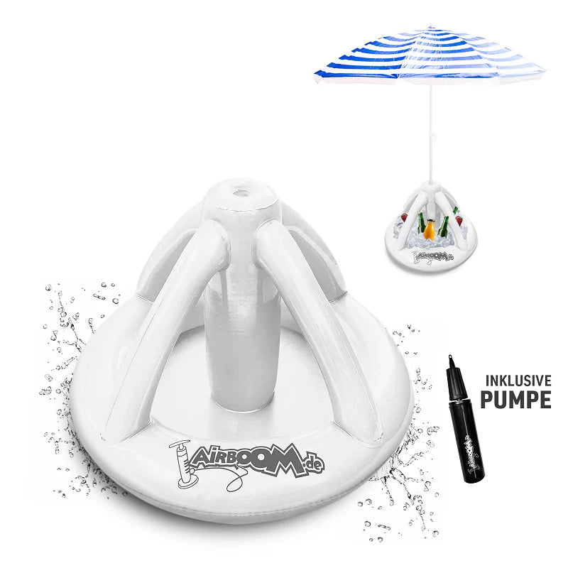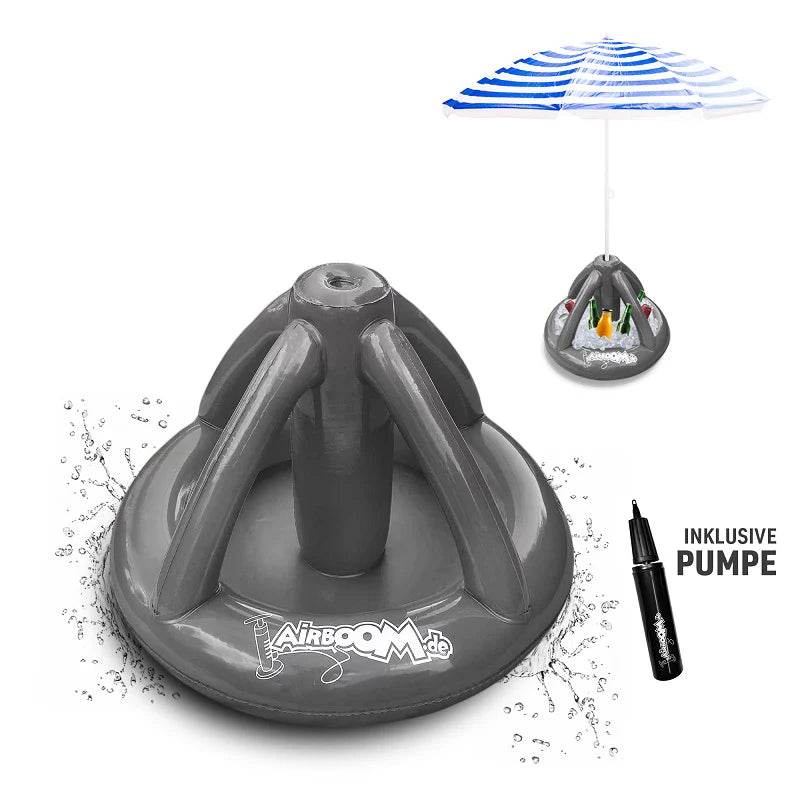 Airboom Blue mit Pumpe – Der aufblasbare Sonnenschirmständer mit Getränkekühler für den Strand