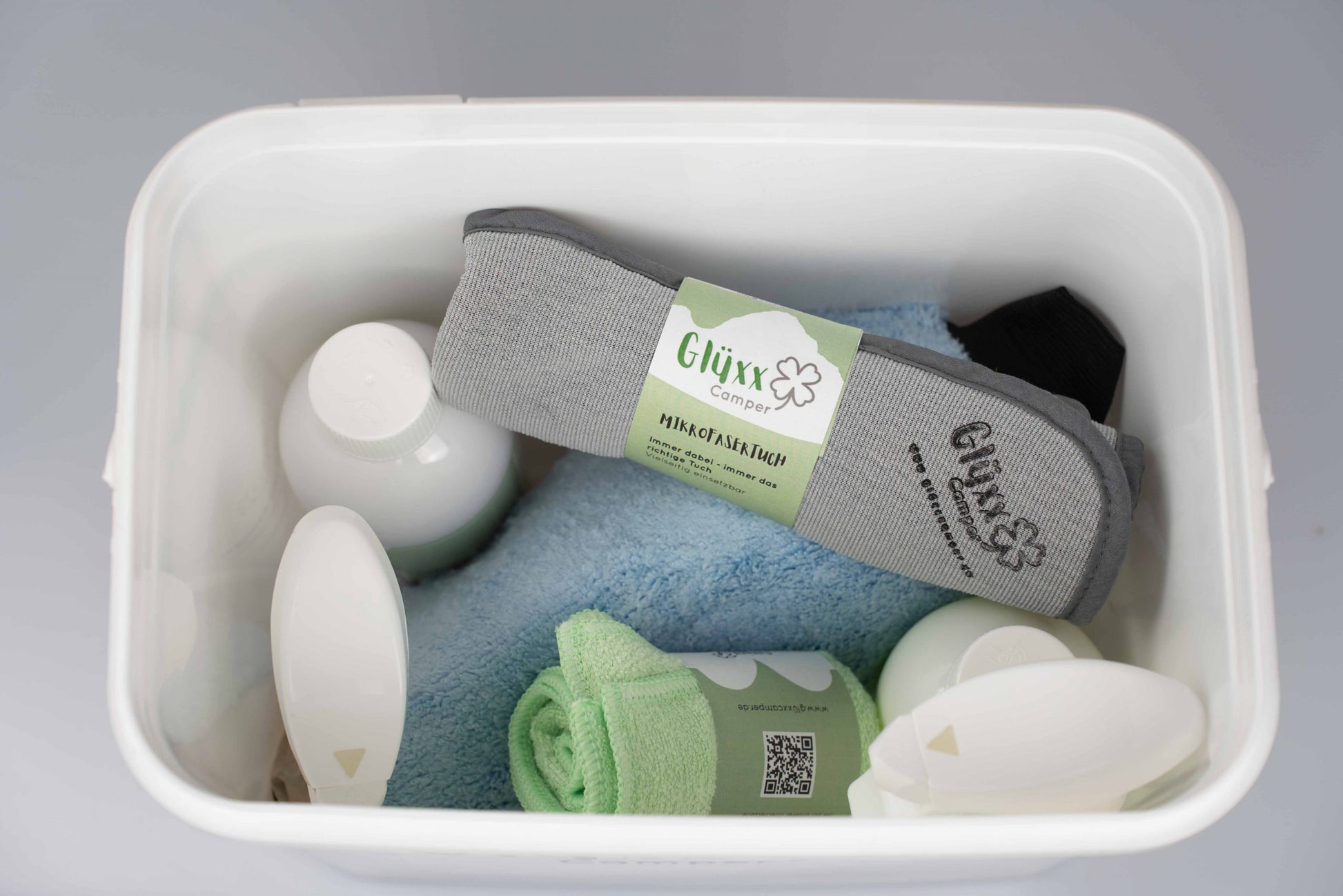 Das Wasch-Komplett-Set wurde von GlüxxCamper erstellt, um den Kunden nach der Neuanschaffung und darüber hinaus eine direkte und saubere Lösung für die Reinigung und Pflege des erworbenen Freizeitmobil zu gewährleisten.